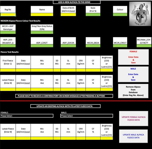 You can add additional alpacas along with their colour test results and update key fleece stats for all your alpacas - remember it's as much about fleece quality as it is colour.
