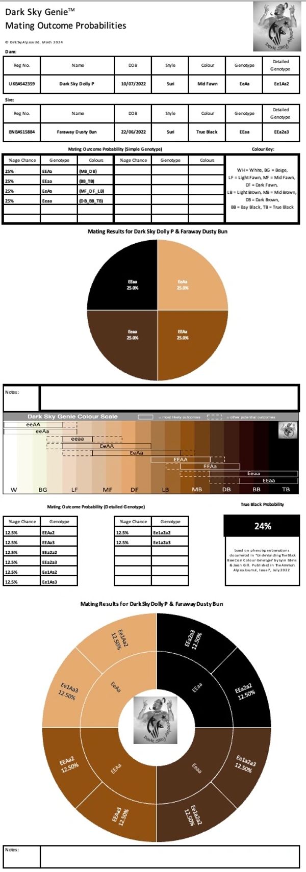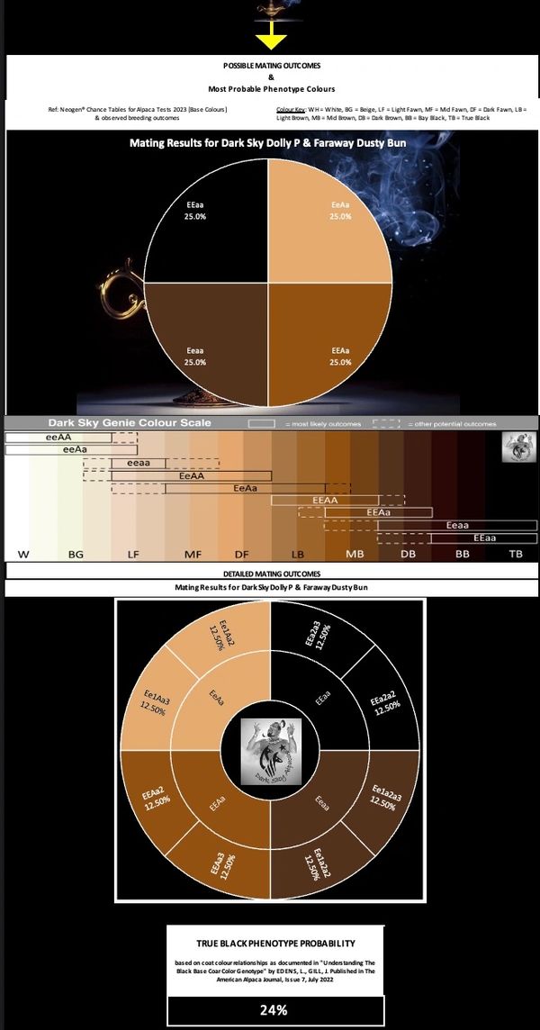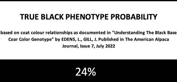 The output of the True Black Phenotype predictor in the Dark Sky Genie™ launch version is modelled on observations made of the Snowmass and Cotton Creek Alpaca Herds in the USA. The sample size was 181 alpacas and their phenotype (observed colour) was mapped against their Neogen Genetic Colour results. This has been translated into a set of probabilities for any particular genetic code resulting in a particular observed colour phenotype.