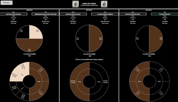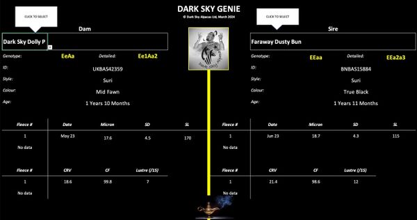 The Dark Sky Genie™ simply presents any fleece data you've supplied or entered alongside the mating choice. This is to help breeders take a more rounded mating decision in addition to colour probability.