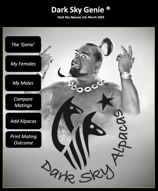 Holding a licence gives you a copy of the Dark Sky Genie™ on your own computer. It allows you to build your own database of females and males over time and helps you track your outcomes against expectations. The licence allows totally unlimited use of the Genie - although we do ask that this is only for your own herd or potential external matings involving your alpacas.