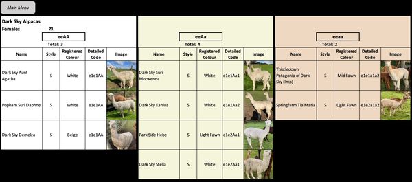 Another new feature shows you a complete catalogue of your alpacas, grouped by basic colour code and also showing their detailed codes and photos. A really easy way to visualise your alpacas and help you to select who to include in your mating options.